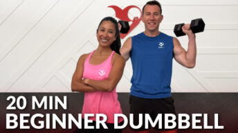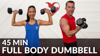 This 30 minute full body workout for strength utilizes compound exercises to efficiently work every body part in a short period of time. You’ll need a pair of dumbbells and will also have an opportunity to use a bench, but it isn’t required. You should choose your weight based on fitness level. This routine includes both a warm up and a cool down.